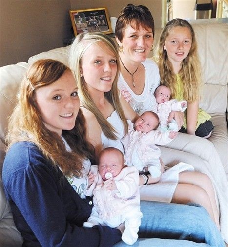 英国一名生过双胞胎的女子,今年5月又生了三胞胎,并且所生的都是女儿。医务人员称,三胞胎中的两个女孩是同卵的,第三个女孩来自一个单独的卵细胞。自然受孕中异卵三胞胎很不寻常,他们出现的机率只有百万分之一。而受孕的妇女怀了双胞胎,其中一个卵子再分裂,形成三胞胎的情形就更少见了。更据调查研究,一个家庭生了双胞胎又生三胞胎的机率只有百万分之一。