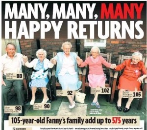 英国柴郡的比灵顿一家的6名姐弟的年龄总计高达575岁,他们分别是——105岁的大姐法妮、102岁的二姐珍妮、98岁的三姐玛丽、92岁的四妹沙拉、90岁的五妹安恩和88岁的六弟阿瑟。令人惊叹的是,6姐弟年龄总计达575岁。堪称是全英国“最高龄家庭”!在6姐弟携手走过近1个世纪后,2008年5月9日大姐法妮·比灵顿迎来她的105岁生日,并收到了来自英国女王的贺信。