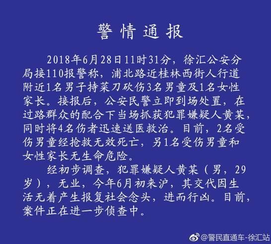 6月28日11时31分,上海徐汇警方接到报警,浦北路近桂林西街人行道附近1名男子持菜刀砍伤3名男童及1名女性家长。警方赶到后及时处置,但2名受伤男童经抢救无效死亡。犯罪嫌疑人黄某(男,29岁),无业,其交代因生活无着产生报复社会念头,进而行凶。