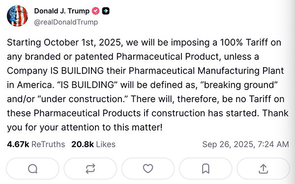 美国时间9月25日,美国总统特朗普在社交媒体宣布一项激进政策:自10月1日起,对所有品牌或专利药品征收100%的关税,除非该制药公司已在美国启动建厂(不论是已动工还是正在施工的工厂)。