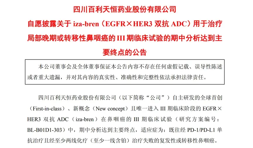 2025年11月21日,国家药监局药品审评中心(CDE)正式受理了百利天恒研发的双抗ADC药物iza-bren(BL-B01D1)用于治疗局部晚期或转移性鼻咽癌的上市申请。
