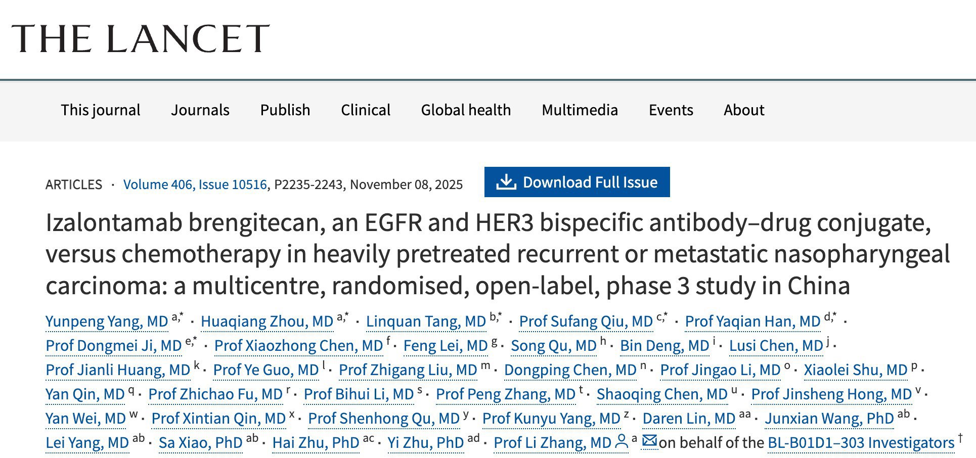 ◎ 张力教授开展的iza-bren鼻咽癌3期临床研究成果被国际顶级医学期刊《柳叶刀》发表。/ 图:《柳叶刀》官网